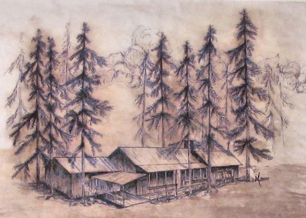 "Mountain Lodge" An abandoned lodge somewhere up in the Rocky Mountains. 1995 Ink and ink wash